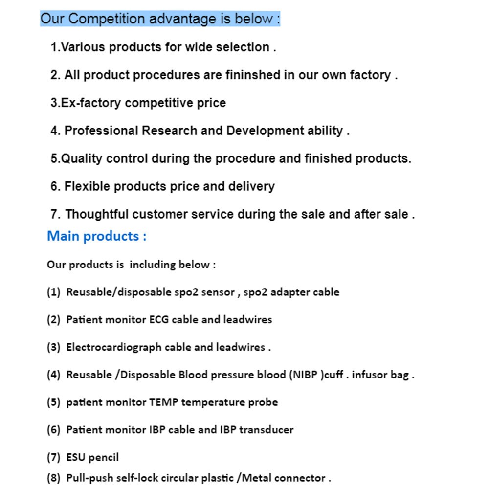 Shenzhen Greatmade Tech LTD er framleiðandi lækningatengsla, sem er mikið notaður með fjölbreytum sjúklingaskjá, púlsoximeter, EKG tæki, blóðþrýstingsmonti, rafskurðaðgerðseining. Við höfum 10 ára reynslu á þessu sviði. Við höfum eigin verksmiðju okkar í Shenzhen Kína meginlandi, og höfum fullkomið framleiðslutæki og prófunartæki. Við byggjum einnig faglega rannsóknar- og þróunarteymi til að fullnægja ýmsum markaðsþörfum. Yfirburði gæði okkar, hagkvæmt verð og hugsi þjónusta hefur aukið varanlegan stuðning innlendra og alþjóðlegra viðskiptavina.